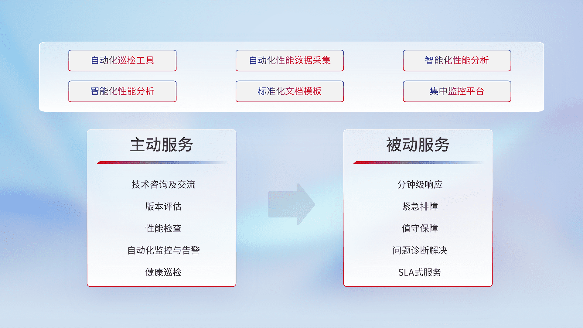 智能化工具和标准化文档,,,,保障服务质量,,提供主动服务(包含技术咨询、、、版本评估、、、性能检查、、、、自动化监控与告警、、健康巡检)和被动服务包含(分钟级响应、、紧急排障、、、值守保障、、、问题诊断解决、、SLA服务)。。。