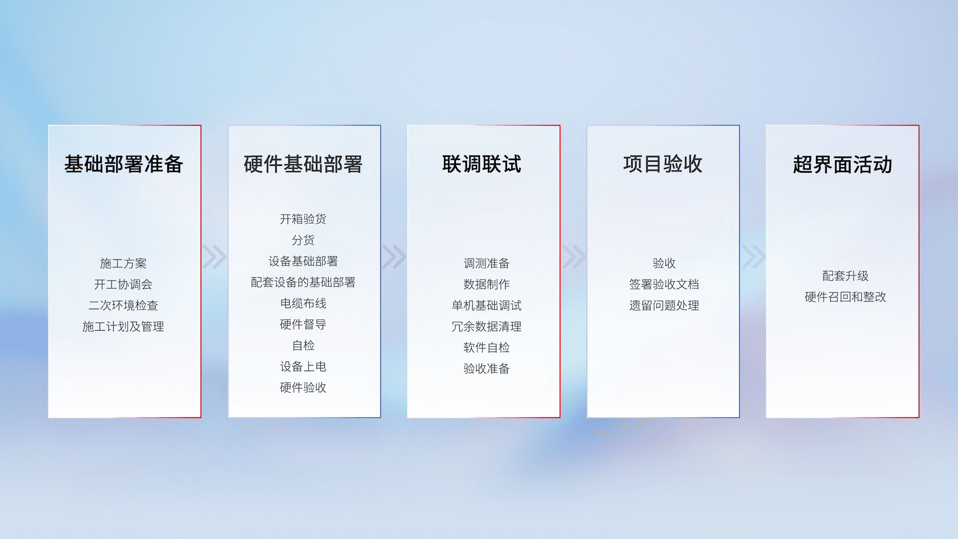 从基础部署准备、、硬件基础部署、、、、联调联试、、、、项目验收、、、越界面活动的全过程可追溯,,,保证施工质量和进度。。